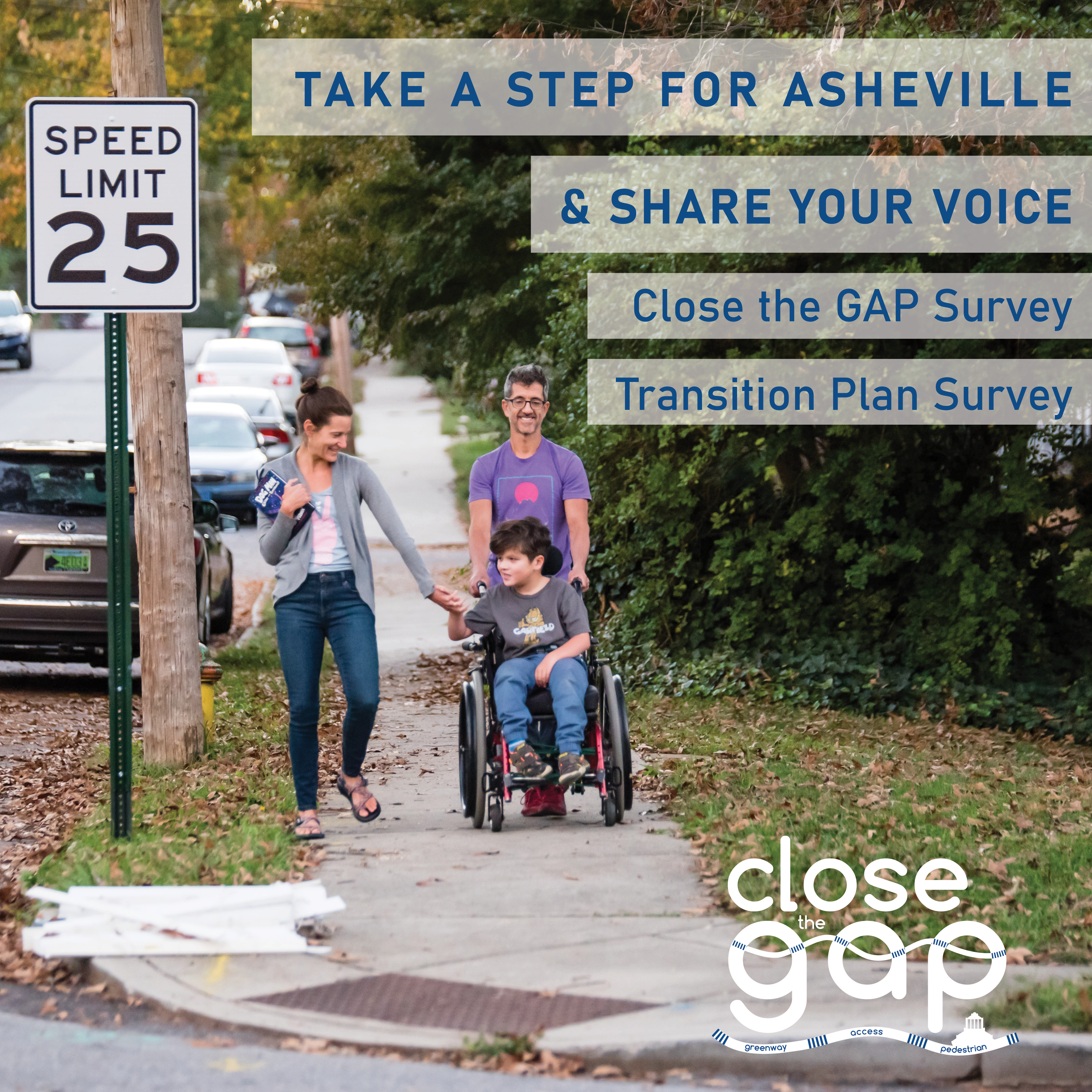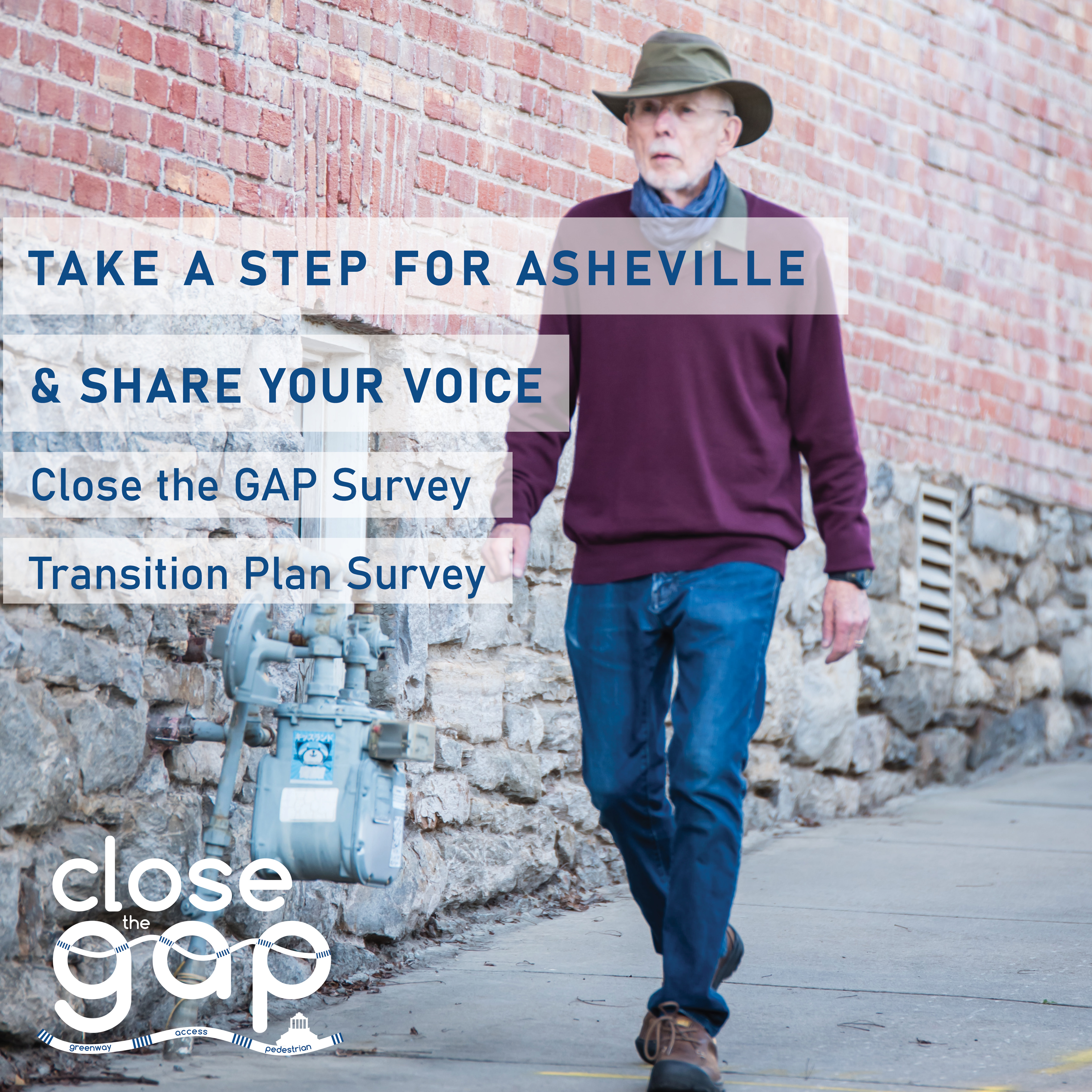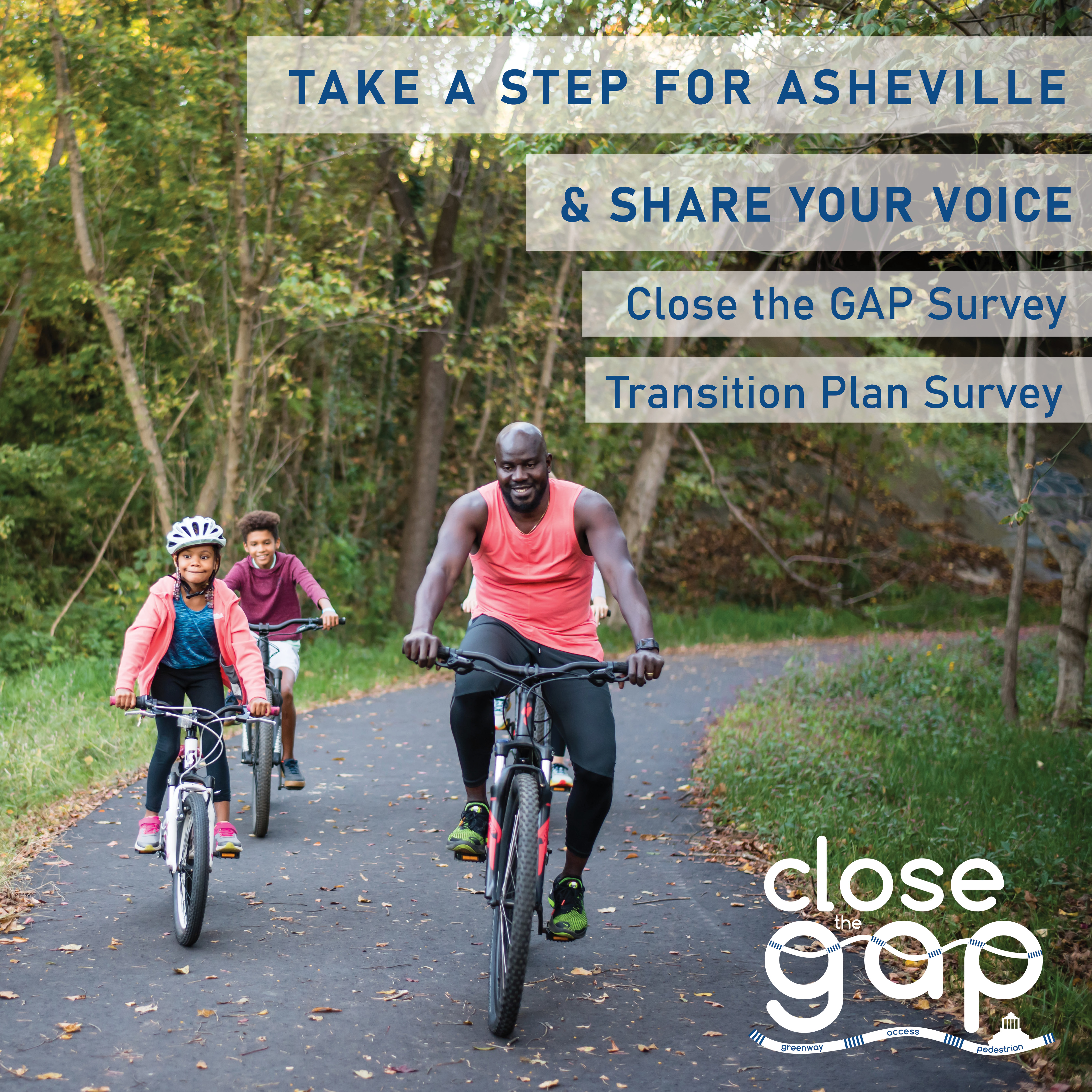 - Close the GAP survey This survey addresses sidewalks and greenways in Asheville. It also has questions related to a new initiative for natural surface trails (aka dirt trails) in Asheville.