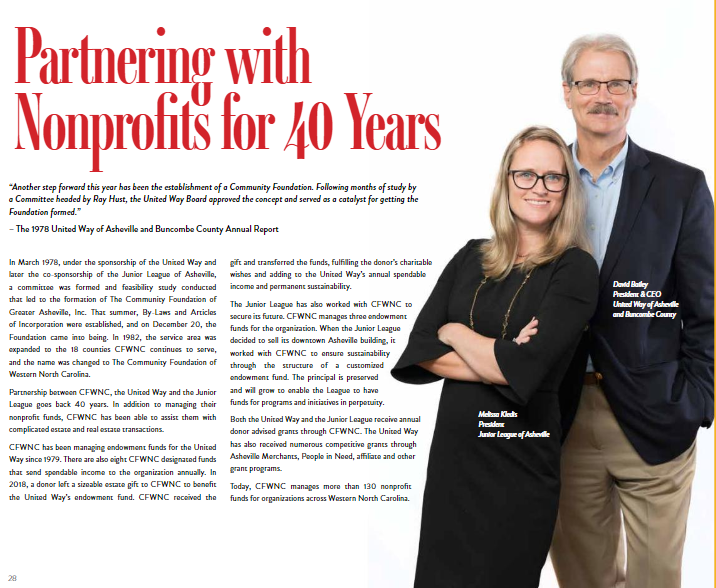 As time passes, and staff members change, the origin stories of organizations can sometimes become more faint, even forgotten. This is not the case for the Community Foundation of Western North Carolina. As active present day partners, our two organizations share a dedication to our community and a lasting and intertwined history.